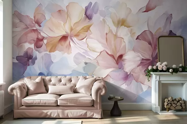 Τοιχογραφίες Αφηρημένα φανταστικά λουλούδια σε αποχρώσεις του ροζ, του ροδακινί και της λεβάντας, σε ζωγραφικό στυλ, με υφή Nr. w09767