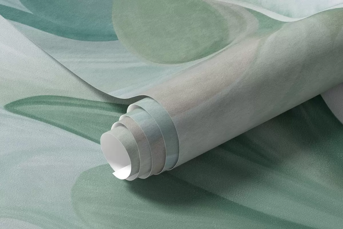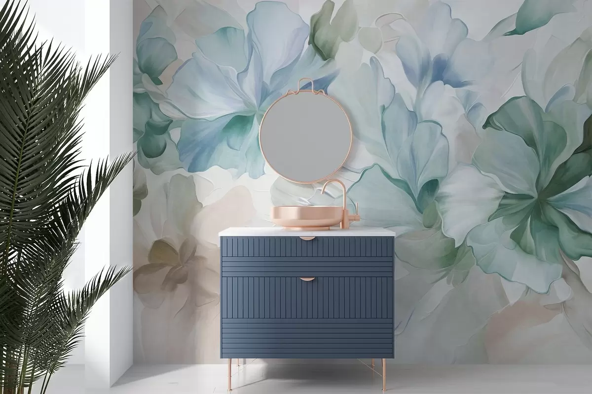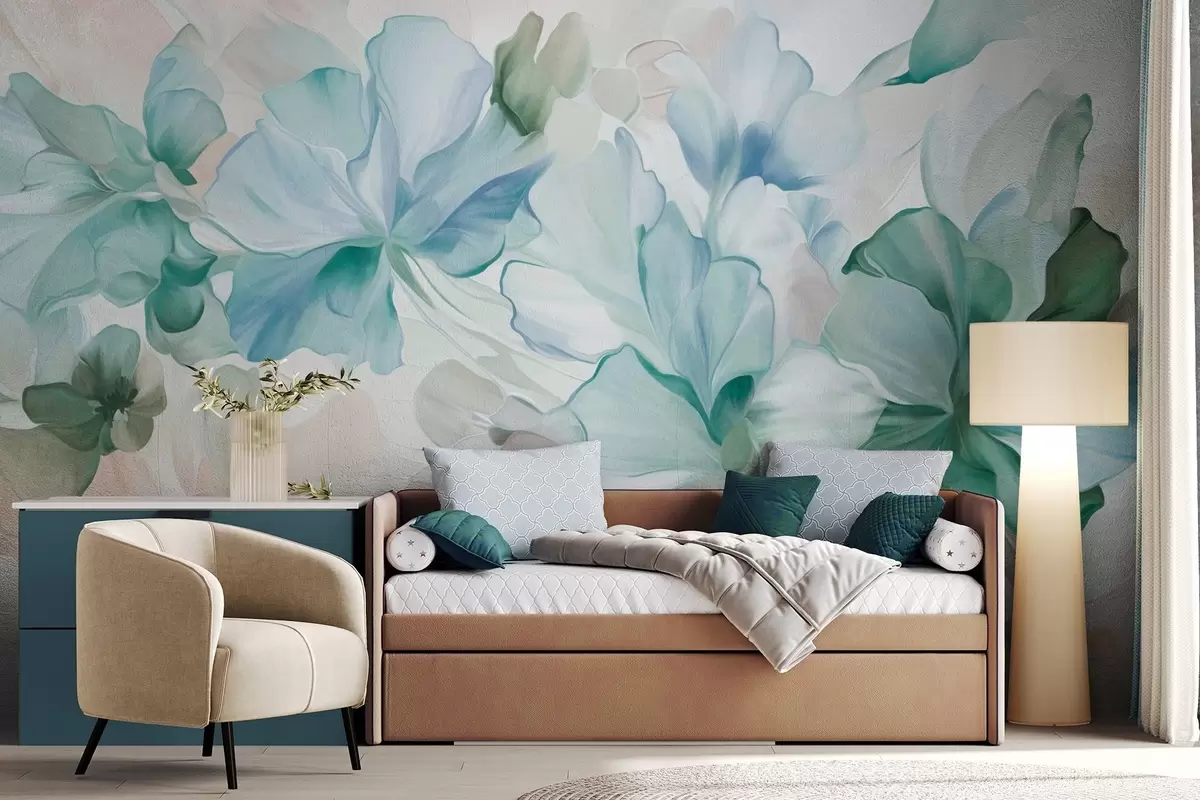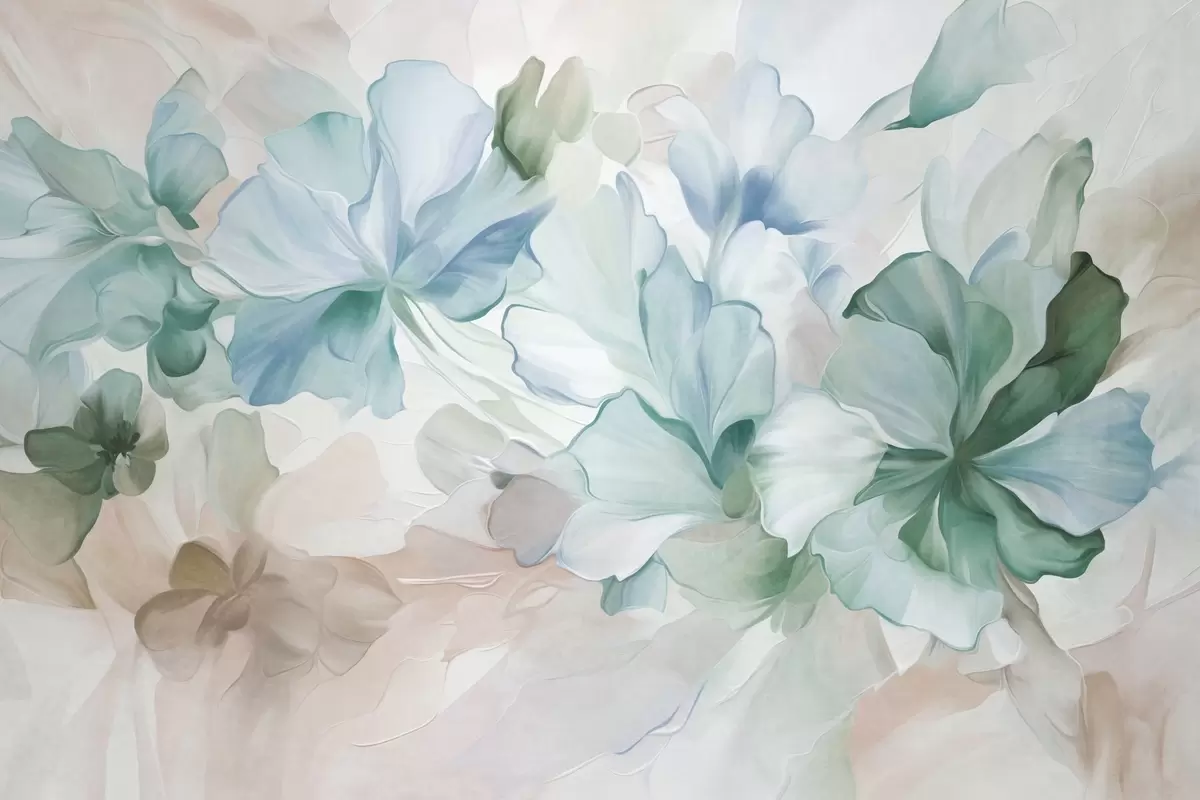 Τοιχογραφίες Αφηρημένα φανταστικά λουλούδια σε αποχρώσεις του πράσινου, του μπλε και του μπεζ, σε ζωγραφικό στυλ, με υφή Nr. w09767v1