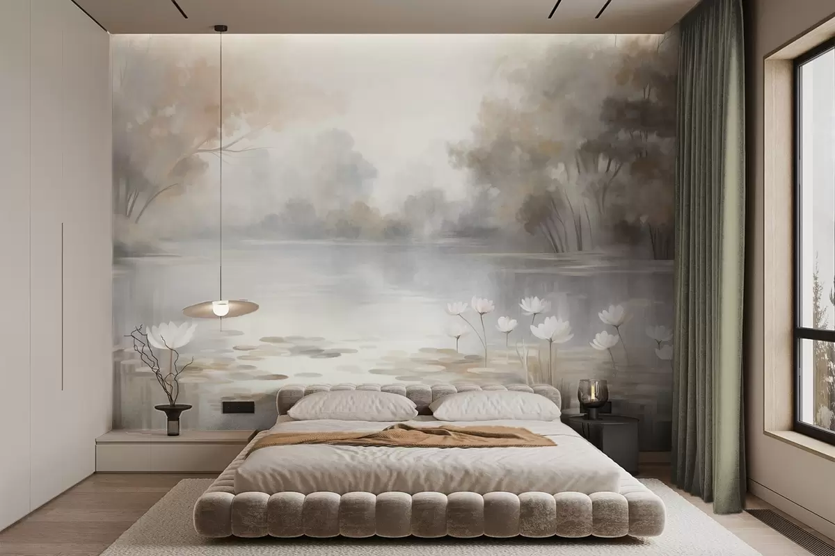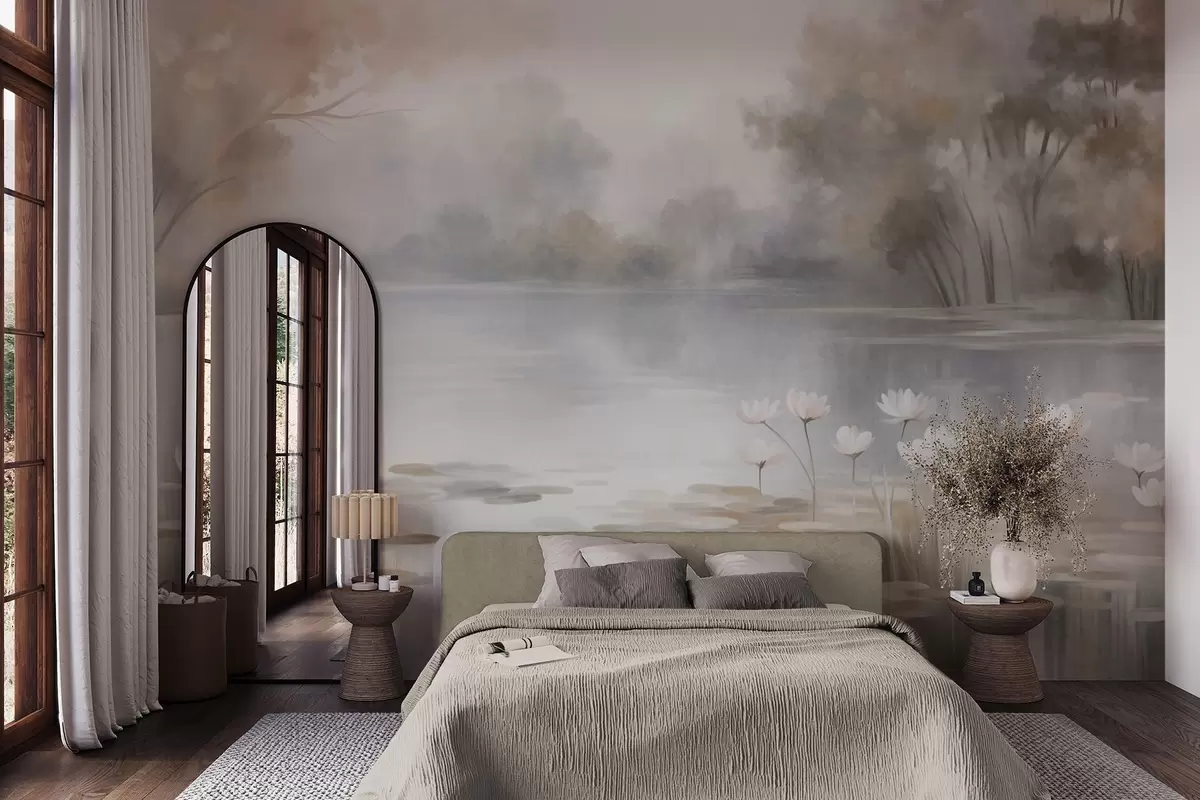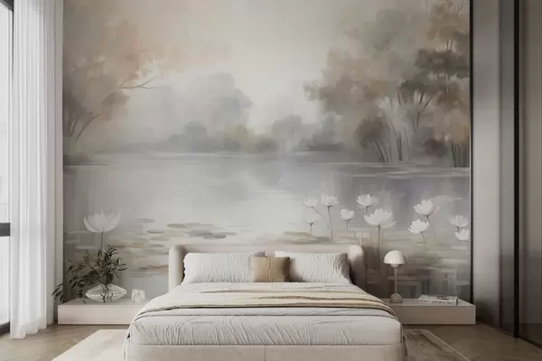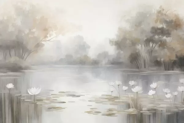 Τοιχογραφίες Τοπίο με ανάγλυφη υφή, λίμνη με λευκά νούφαρα, περιτριγυρισμένη από δέντρα σε απαλές αποχρώσεις Nr. w09768