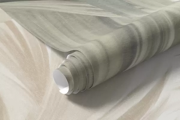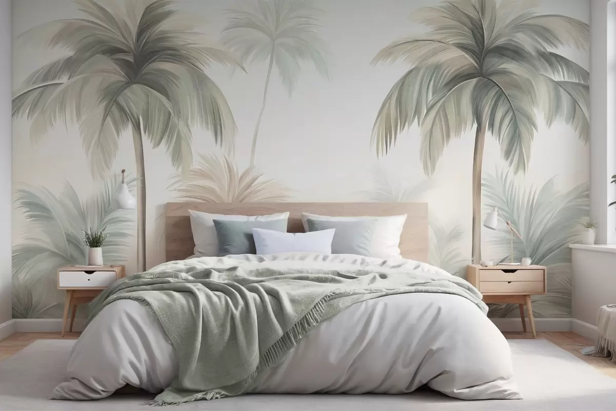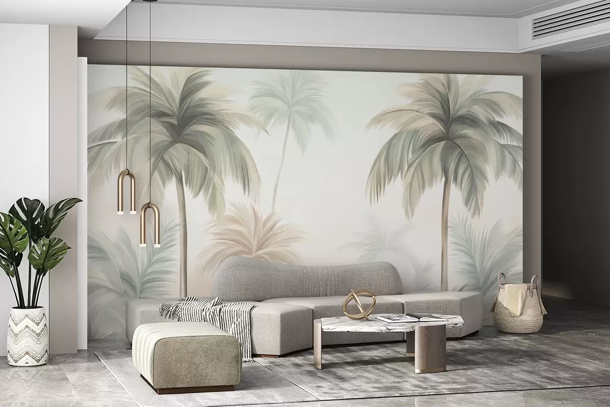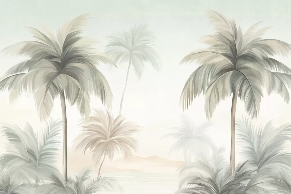 Τοιχογραφίες Φοίνικες με υφή φύλλων σε απαλές αποχρώσεις του πράσινου και του μπεζ, με φόντο έναν απαλό ουρανό Nr. w09770