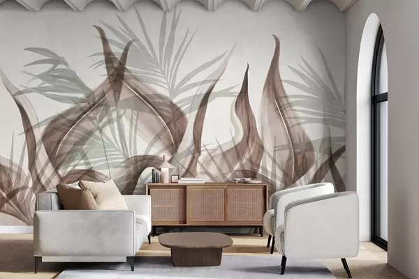 Τοιχογραφίες Τροπικά φύλλα σε αποχρώσεις του καφέ και του πράσινου σε λευκό φόντο, με υφή σε στυλ ακουαρέλας Nr. w09772