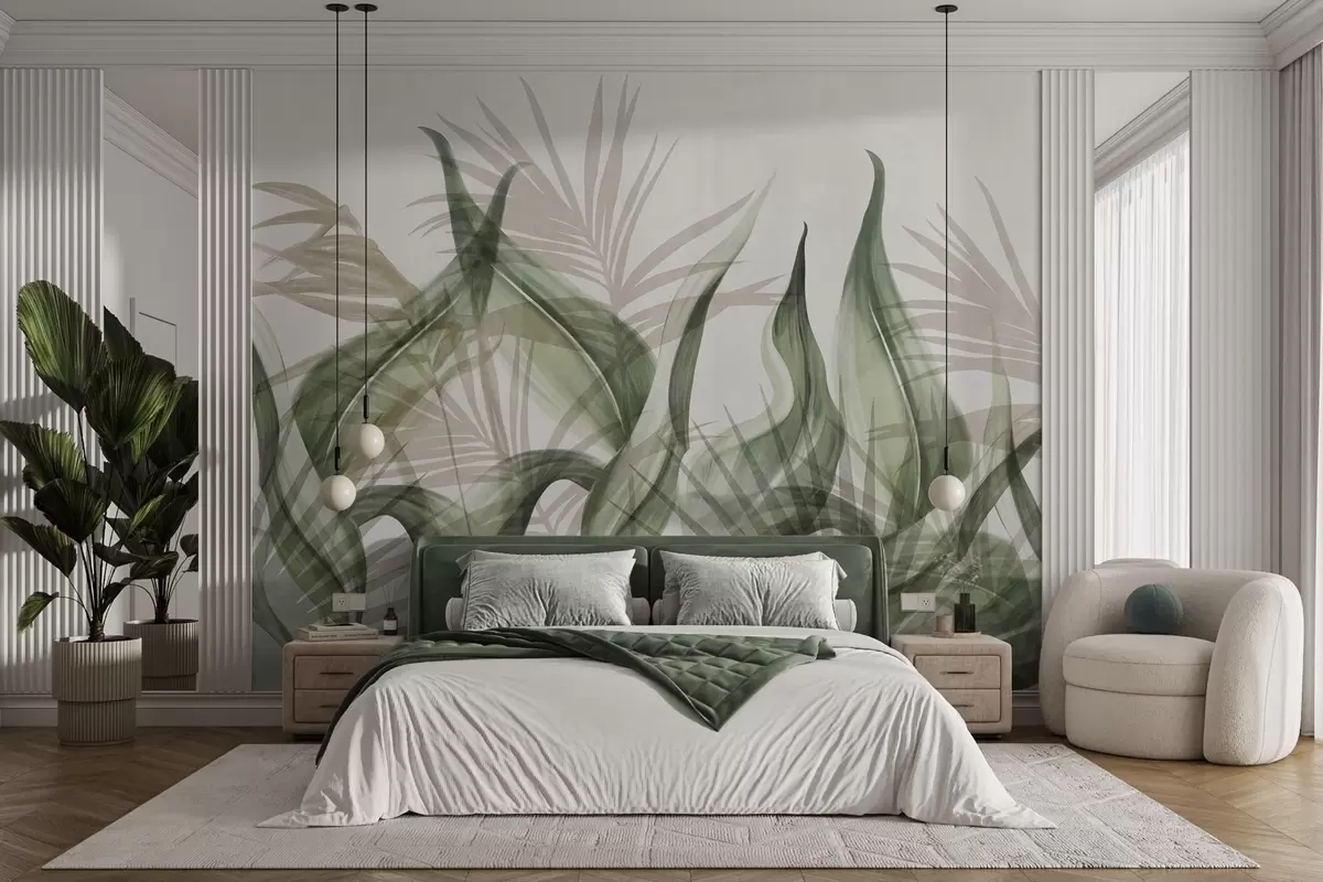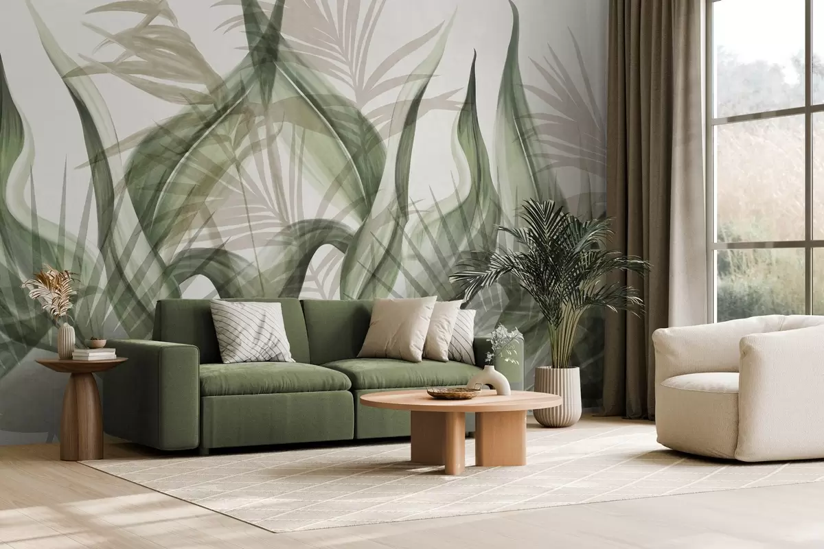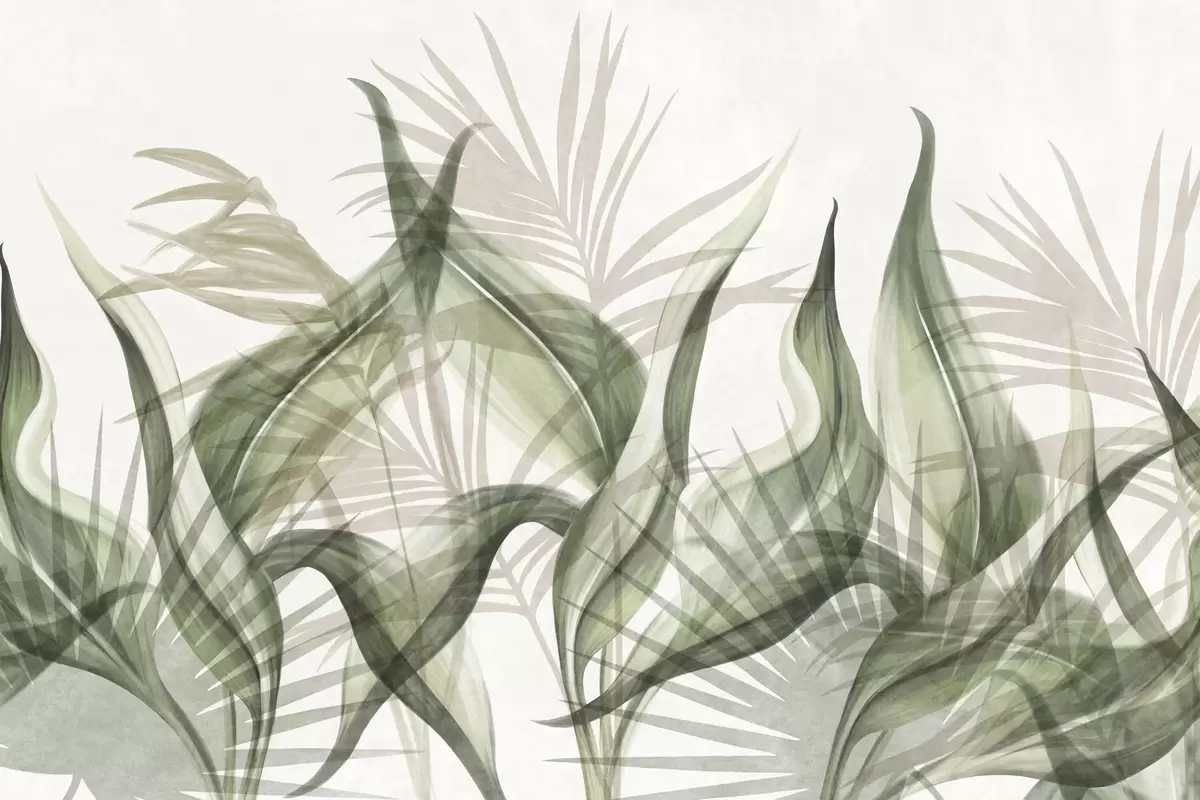 Τοιχογραφίες Τροπικά φύλλα σε αποχρώσεις του μπεζ και του πράσινου σε λευκό φόντο, με υφή σε στυλ ακουαρέλας Nr. w09772v1
