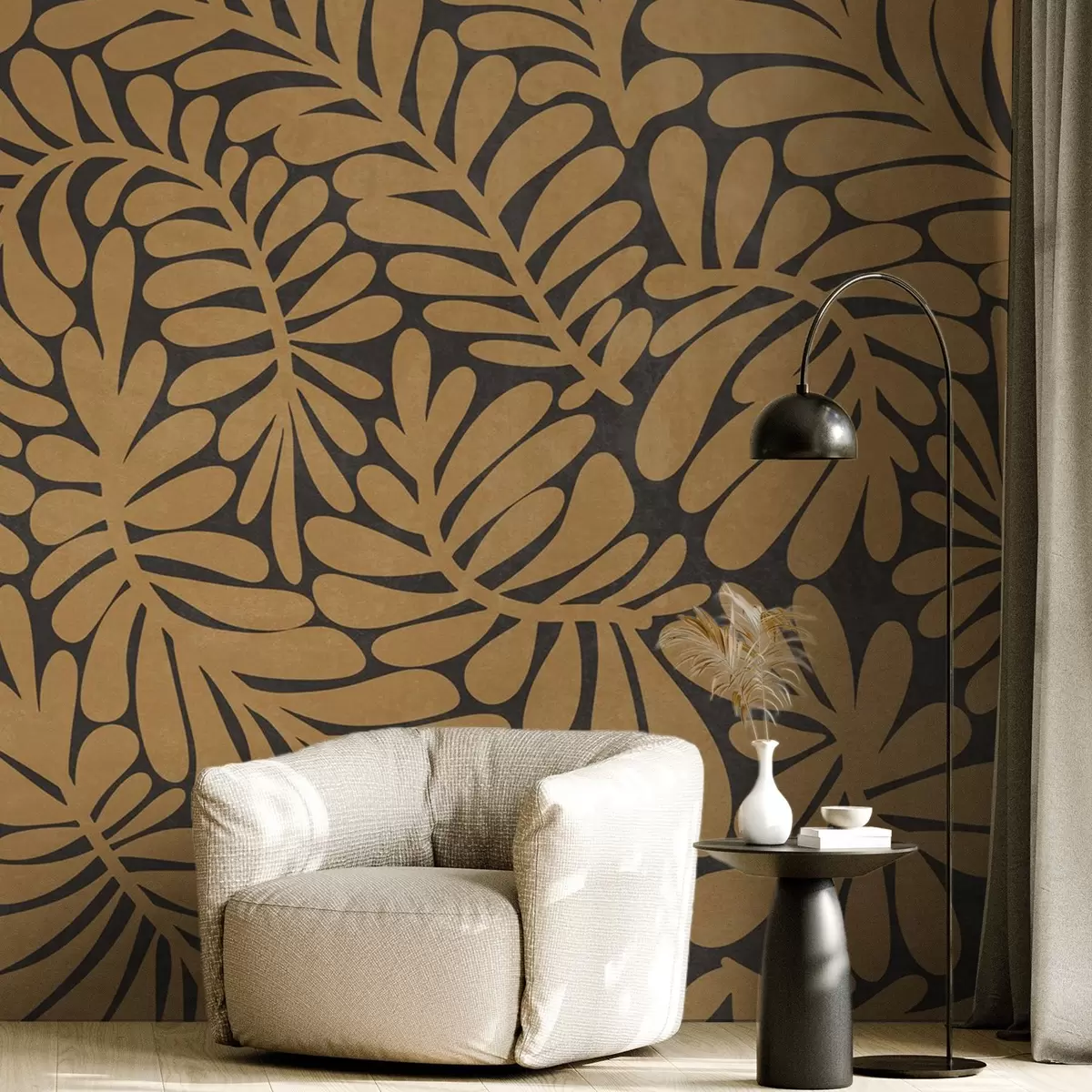 Τοιχογραφίες Στυλιζαρισμένα φύλλα σε κίτρινο χρώμα μουστάρδας πάνω σε σκούρο γκρι φόντο, έργο τέχνης με υφή Nr. w09775