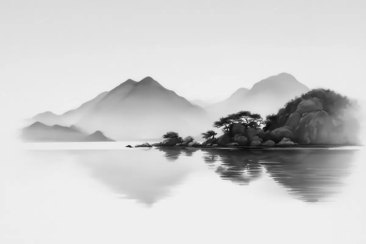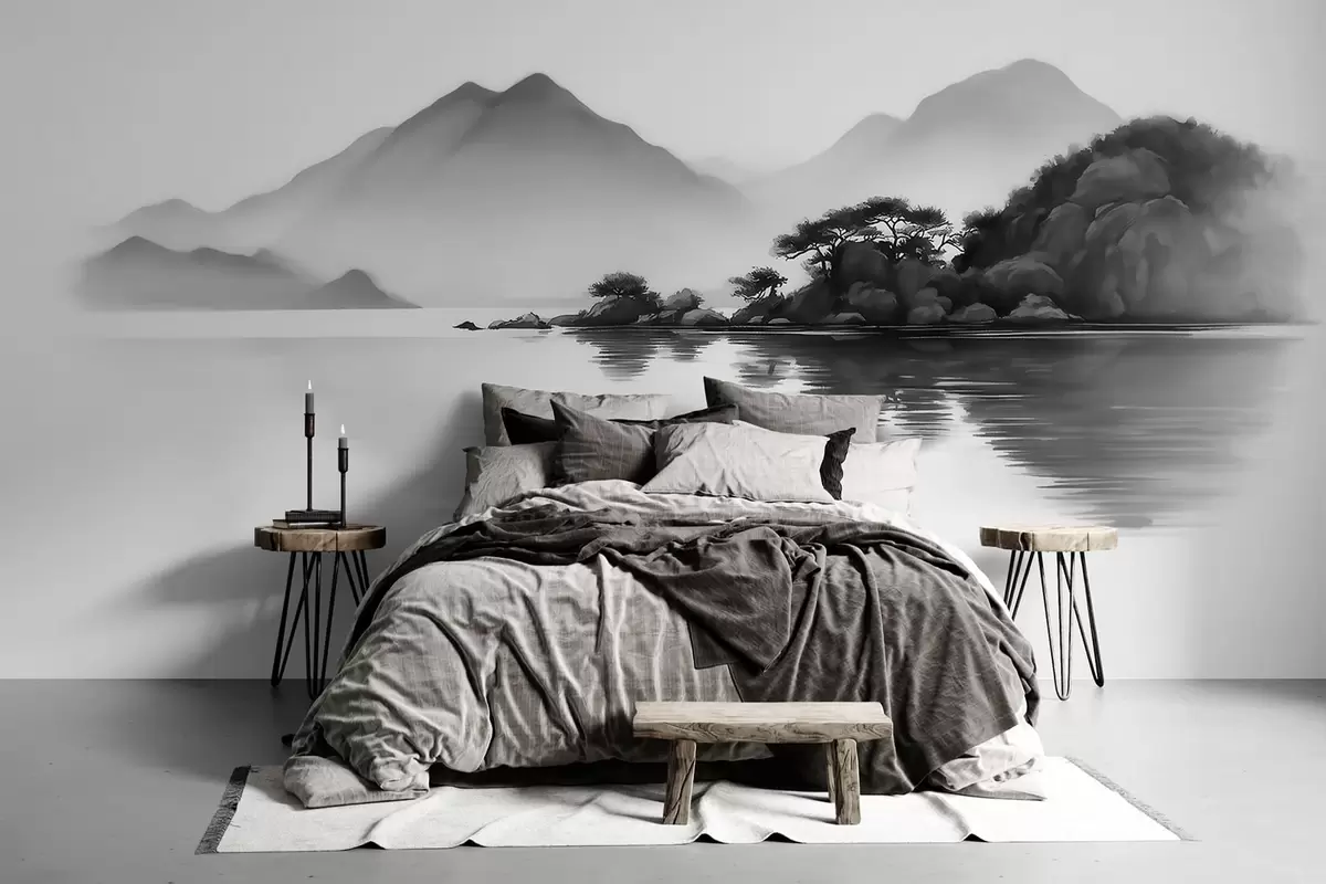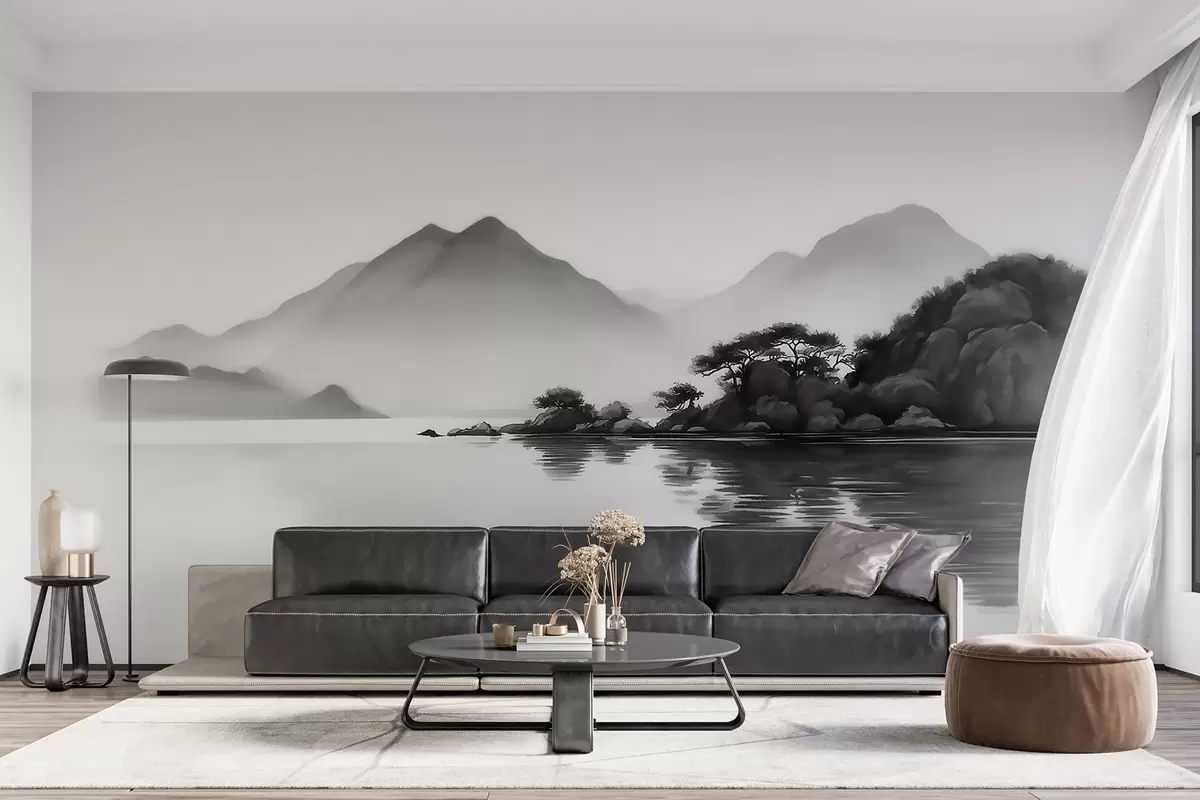 Τοιχογραφίες Ασπρόμαυρο τοπίο με βουνά και λίμνη μέσα σε απαλή ομίχλη Nr. w09803