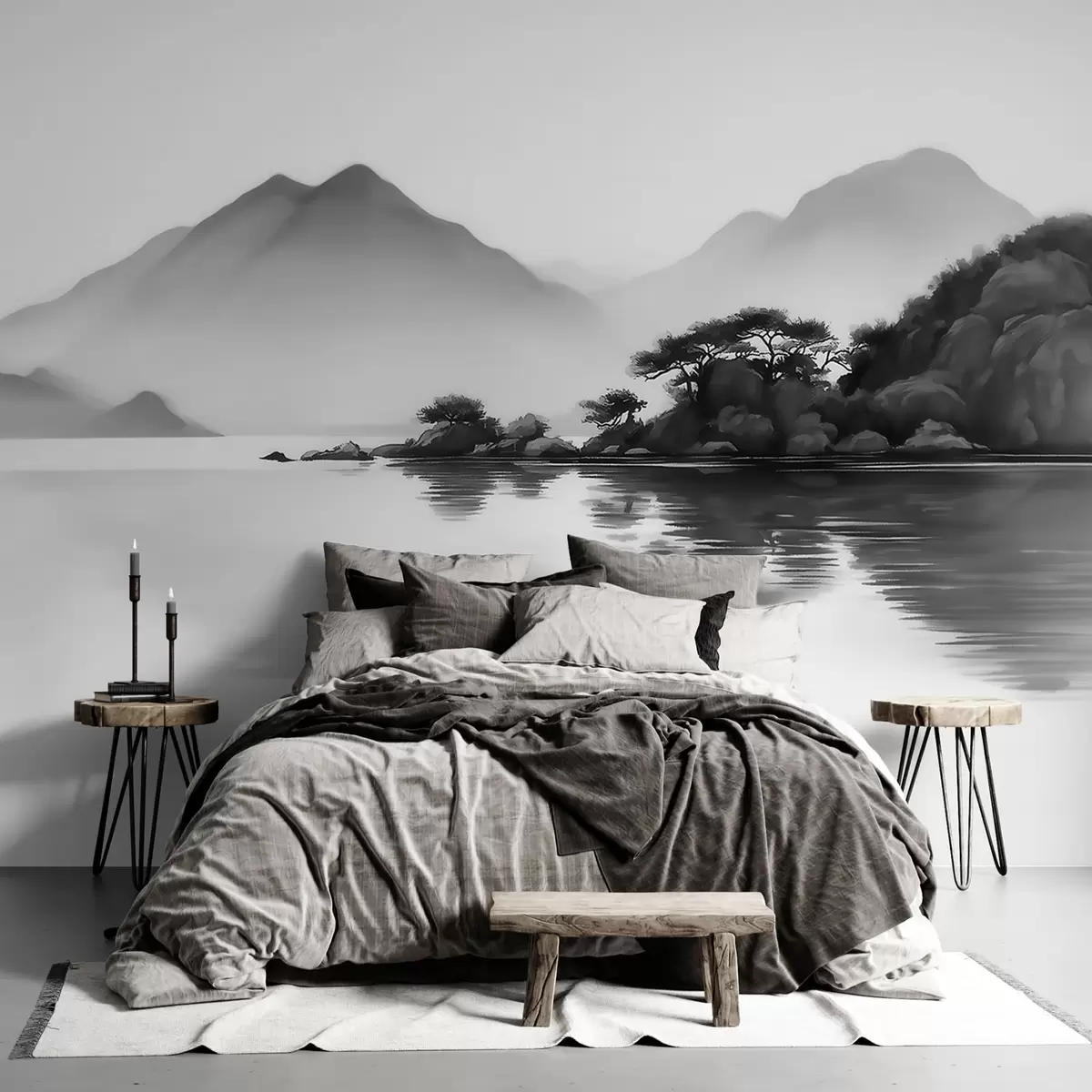 Τοιχογραφίες Ασπρόμαυρο τοπίο με βουνά και λίμνη μέσα σε απαλή ομίχλη Nr. w09803