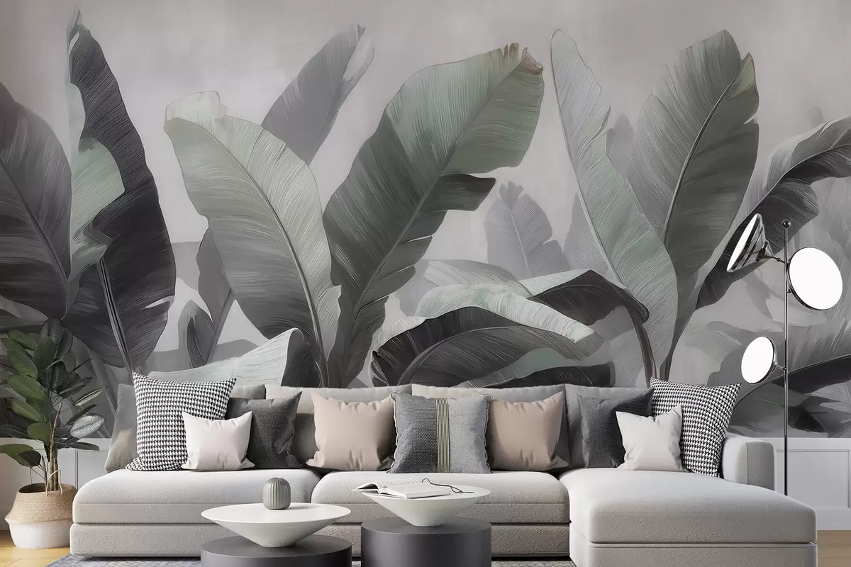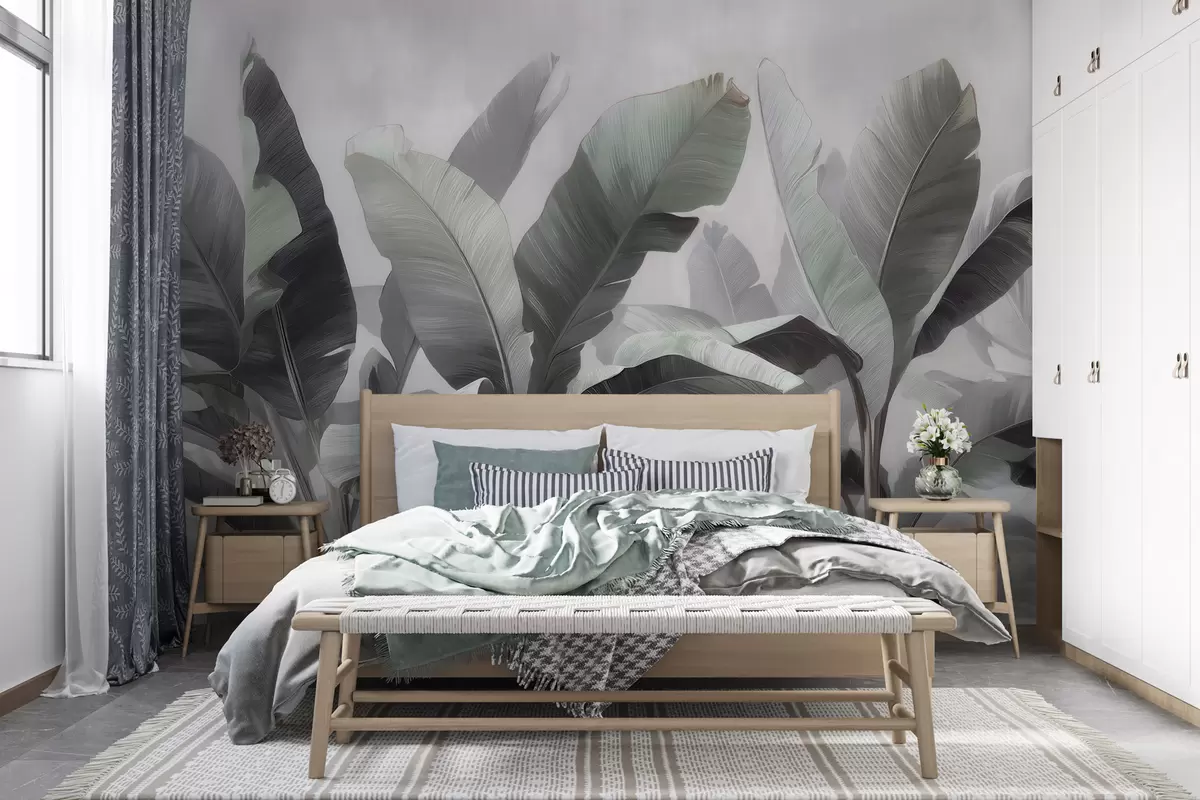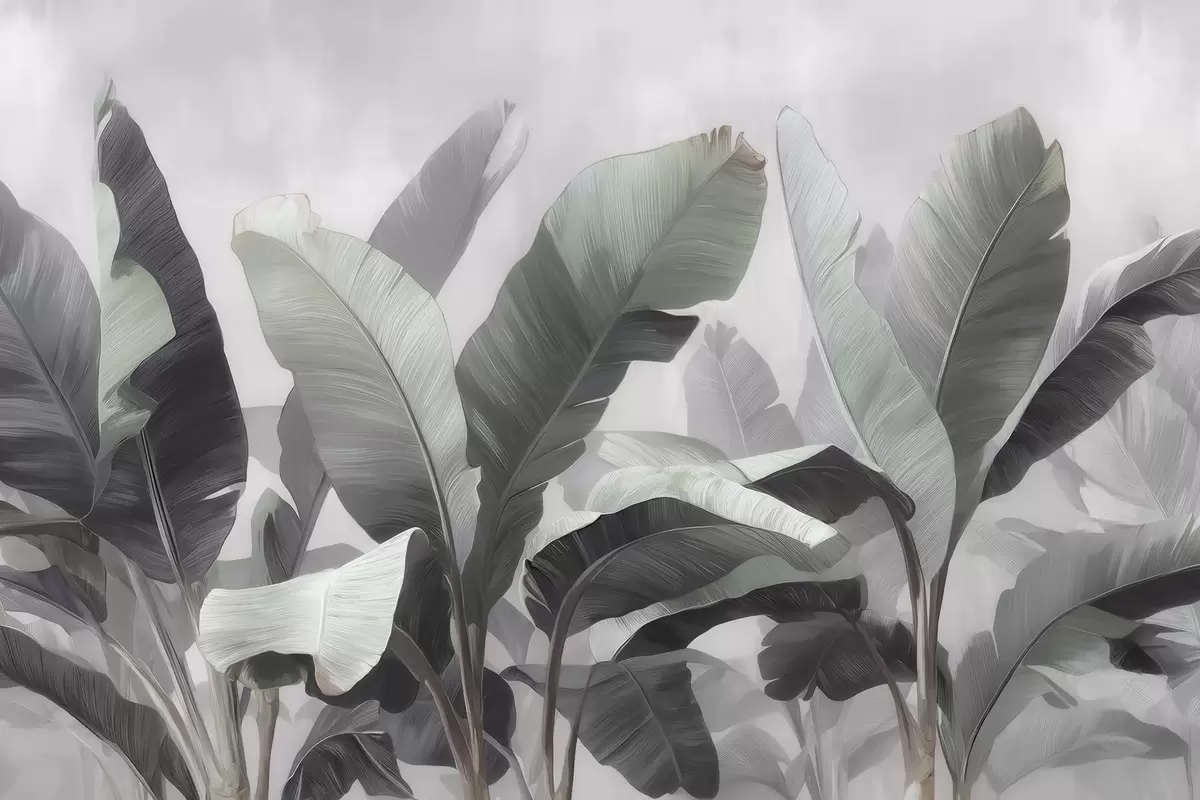 Τοιχογραφίες Αφηρημένα μεγάλα φύλλα μπανανιάς σε τροπικό ύφος, σε ουδέτερη χρωματική παλέτα με απαλές γκριζοπράσινες αποχρώσεις Nr. w09805