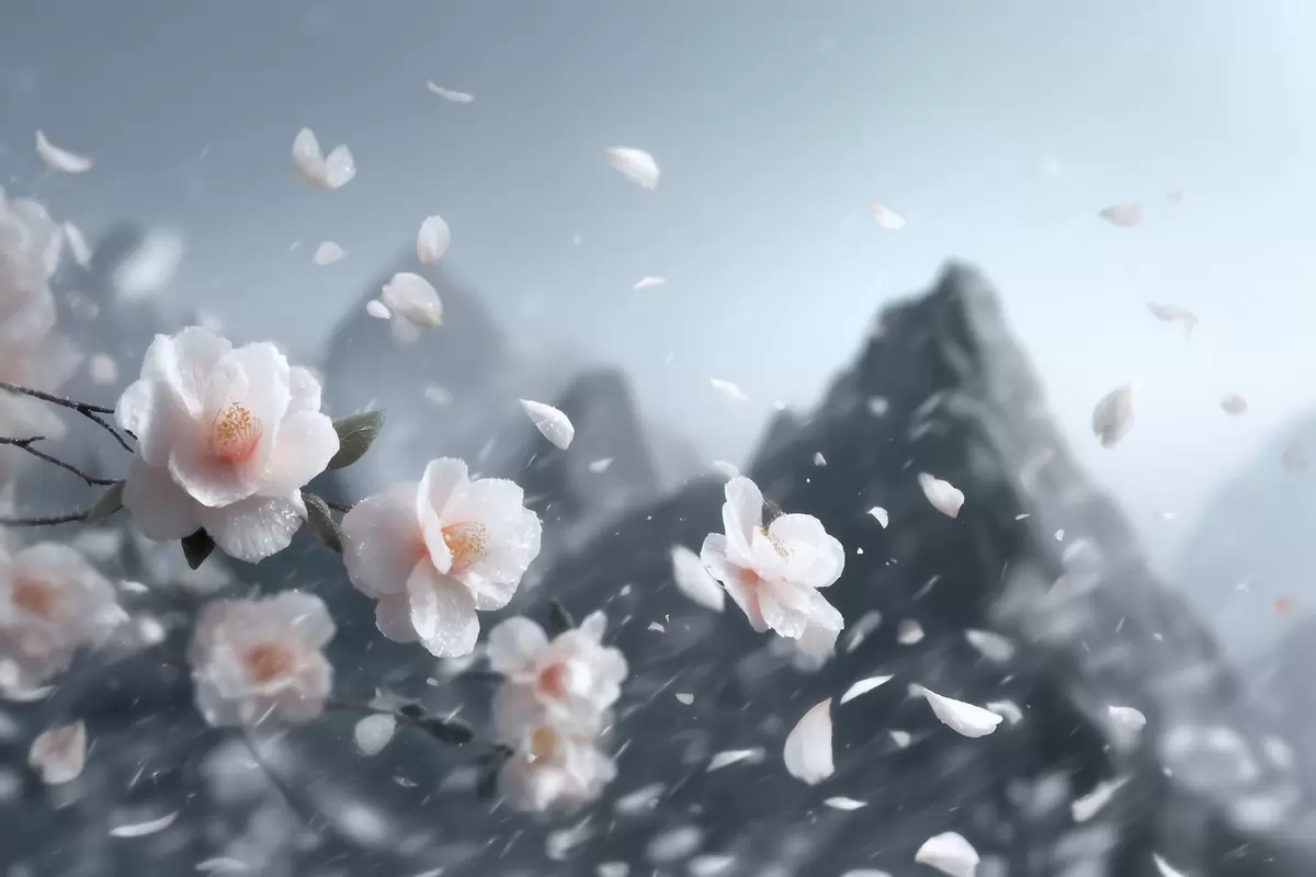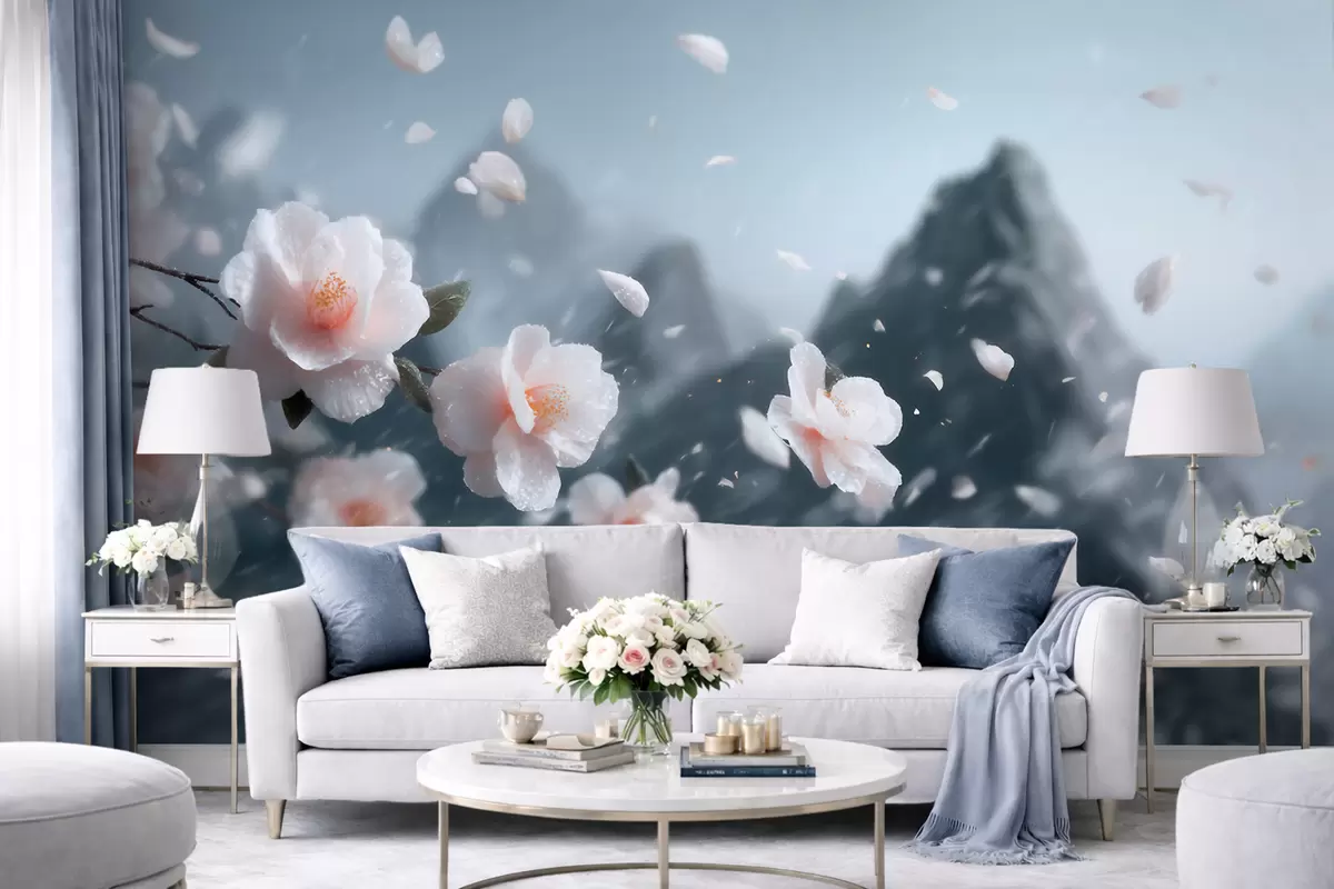 Τοιχογραφίες Λεπτά άνθη κερασιάς με φόντο τα βουνά, ατμοσφαιρικό ιαπωνικό τοπίο σε παστέλ αποχρώσεις Nr. w09808