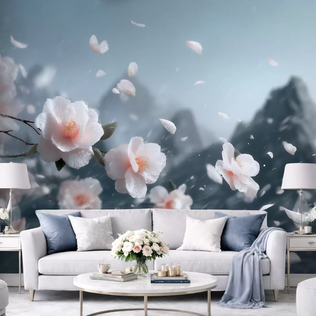 Τοιχογραφίες Λεπτά άνθη κερασιάς με φόντο τα βουνά, ατμοσφαιρικό ιαπωνικό τοπίο σε παστέλ αποχρώσεις Nr. w09808