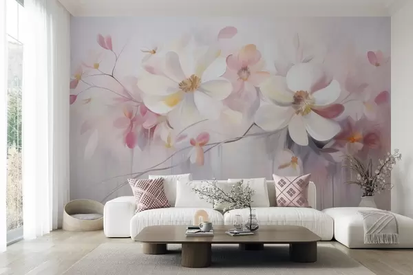 Τοιχογραφίες Λευκά και ροζ λουλούδια με λεπτεπίλεπτα πέταλα, έργο τέχνης με υφή, αφηρημένο, απαλό φόντο Nr. w09811