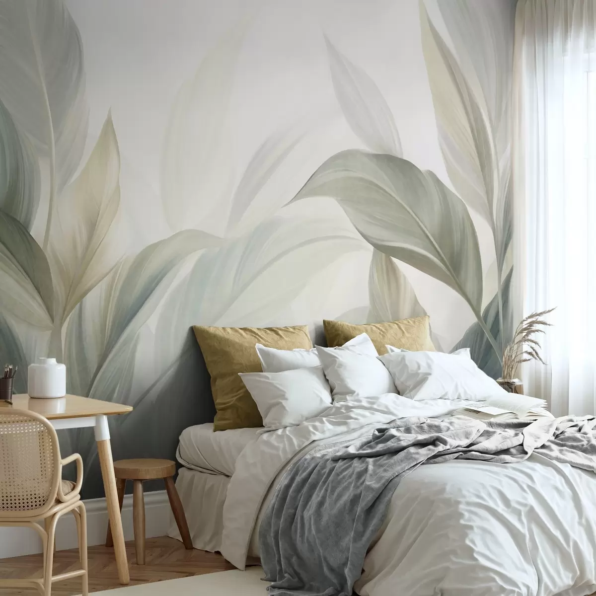 Τοιχογραφίες Μεγάλα, ανοιχτοπράσινα τροπικά φύλλα με απαλά, παστέλ χρώματα, έργο τέχνης με υφή Nr. w09816