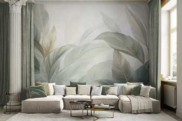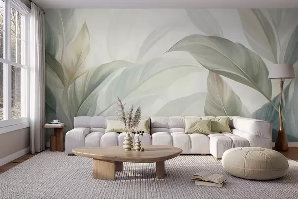 Τοιχογραφίες Μεγάλα, ανοιχτοπράσινα τροπικά φύλλα με απαλά, παστέλ χρώματα, έργο τέχνης με υφή Nr. w09816
