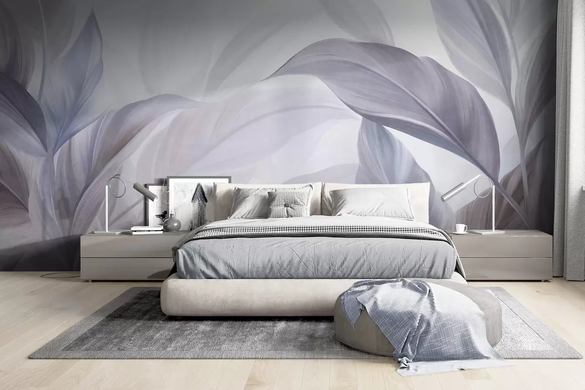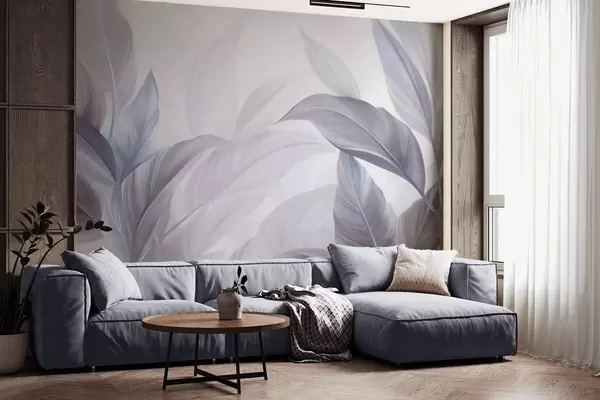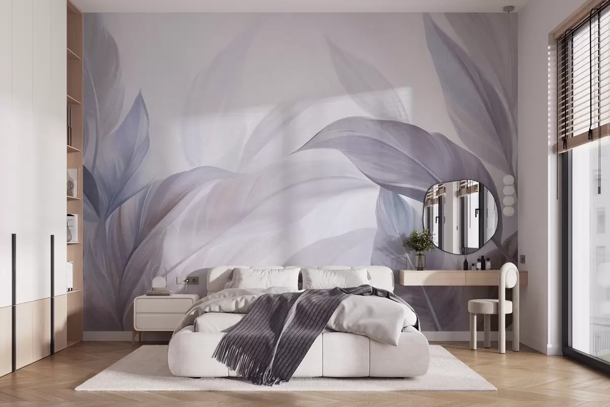 Τοιχογραφίες Μεγάλα, ανοιχτό μπλε και μοβ τροπικά φύλλα με απαλά, παστέλ χρώματα, έργο τέχνης με υφή Nr. w09816v1