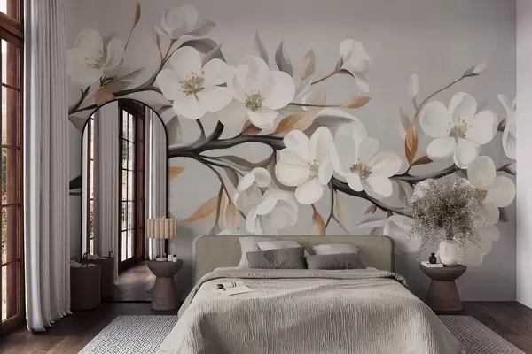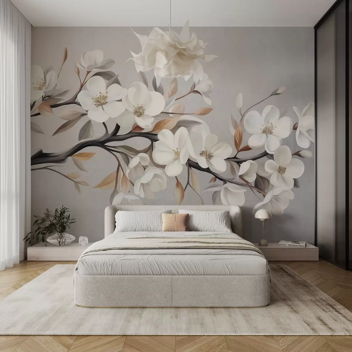 Τοιχογραφίες Κλαδί με ανάγλυφη υφή, λευκά λουλούδια και καφέ φύλλα πάνω σε ανοιχτό γκρι φόντο Nr. w09817