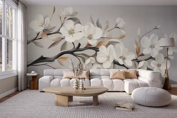 Τοιχογραφίες Κλαδί με ανάγλυφη υφή, λευκά λουλούδια και καφέ φύλλα πάνω σε ανοιχτό γκρι φόντο Nr. w09817