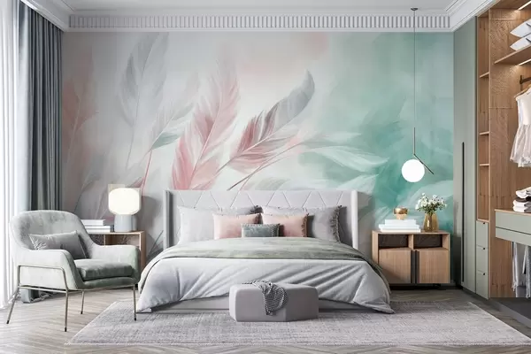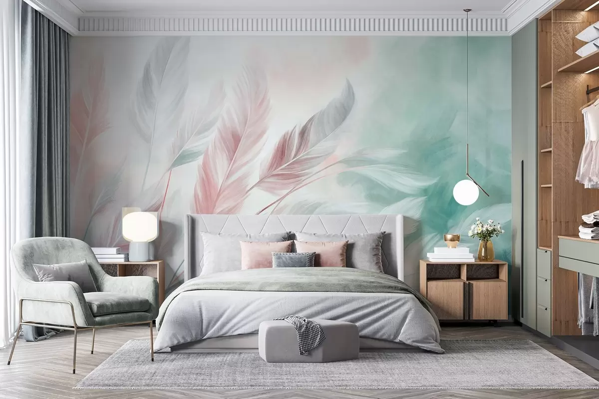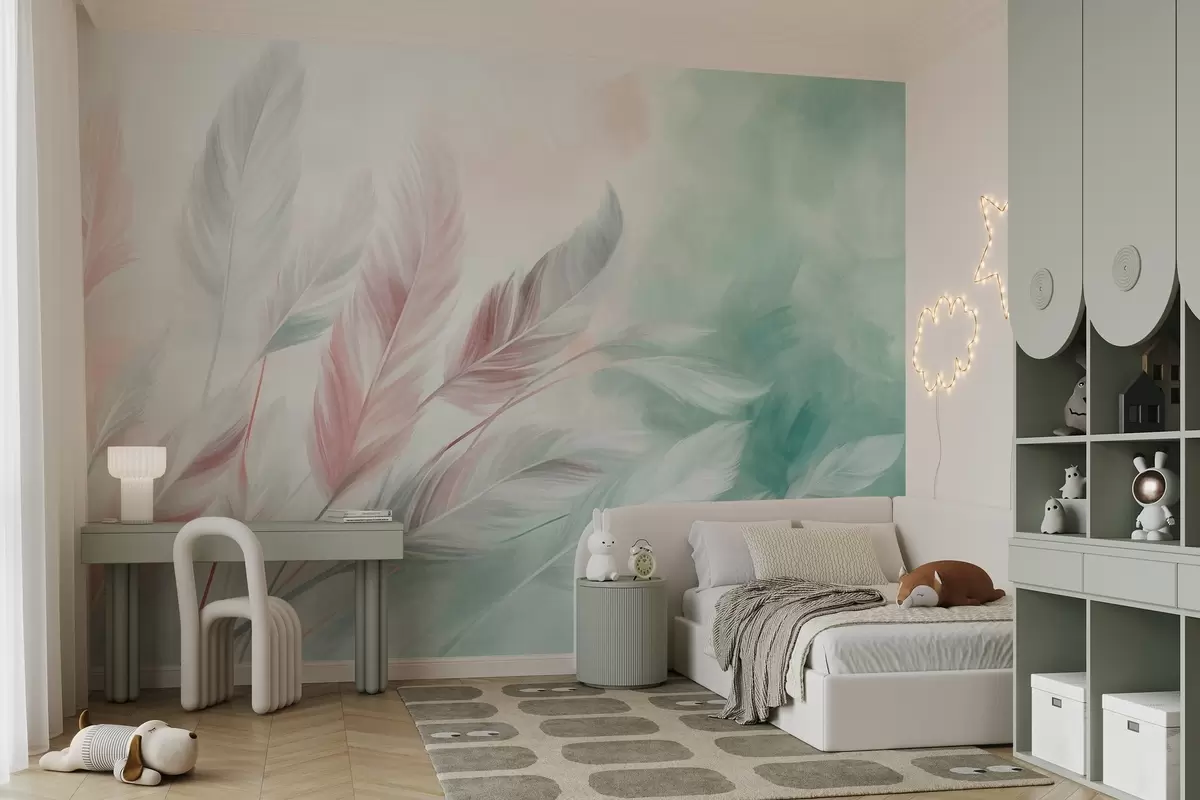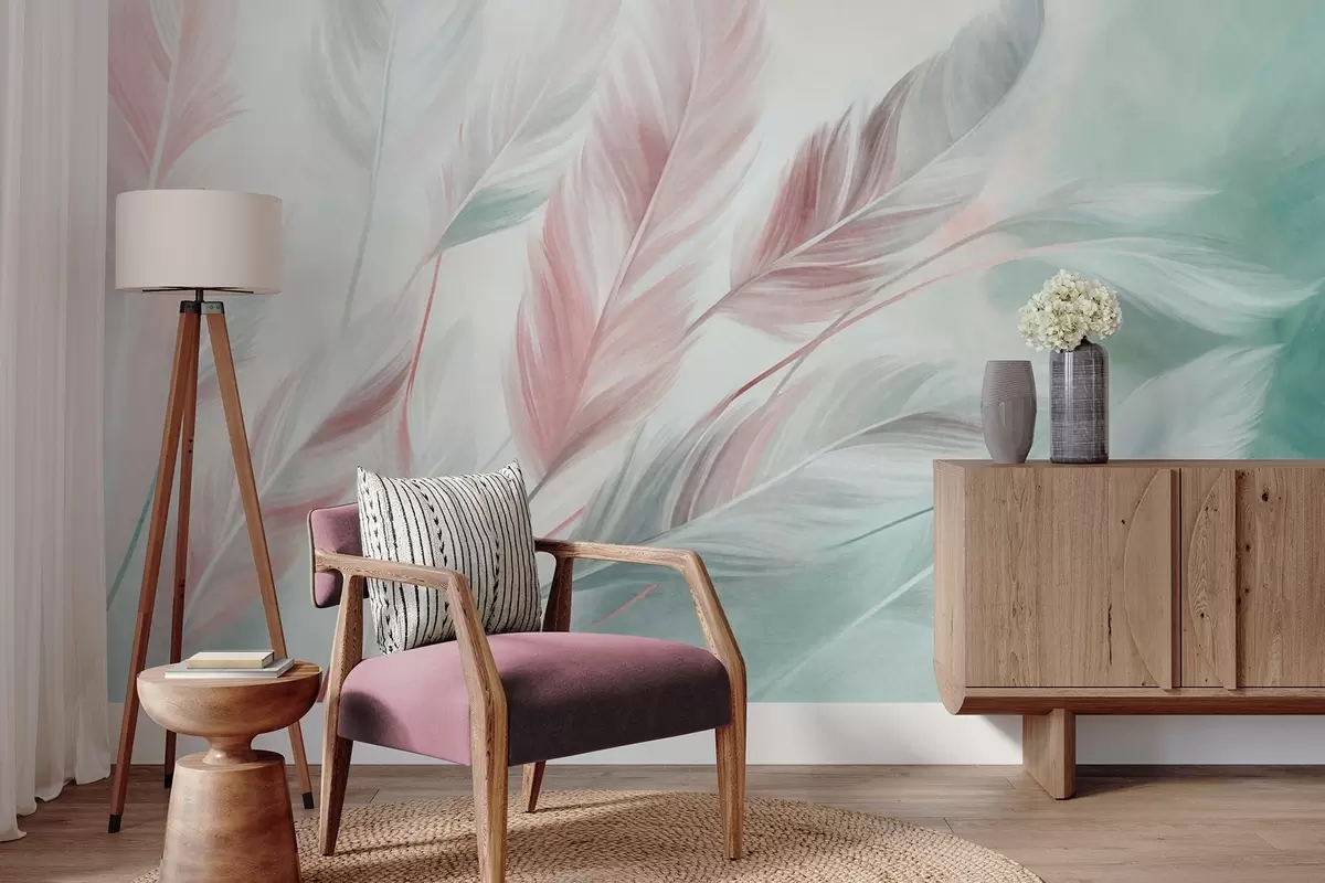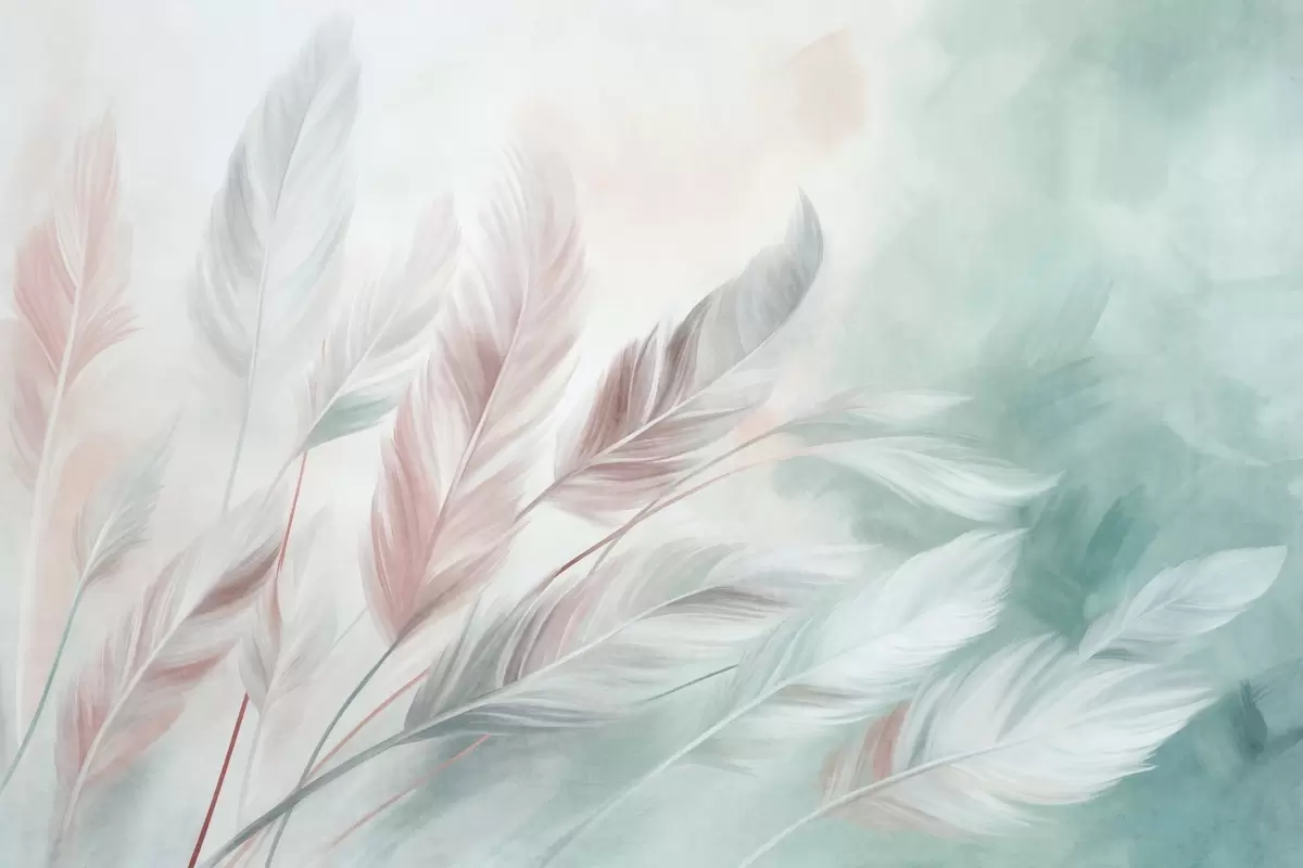 Τοιχογραφίες Φτερά σε παστέλ αποχρώσεις με ανάγλυφη υφή και απαλές, λεπτές άκρες, πάνω σε φόντο σε στυλ ακουαρέλας Nr. w09833v1