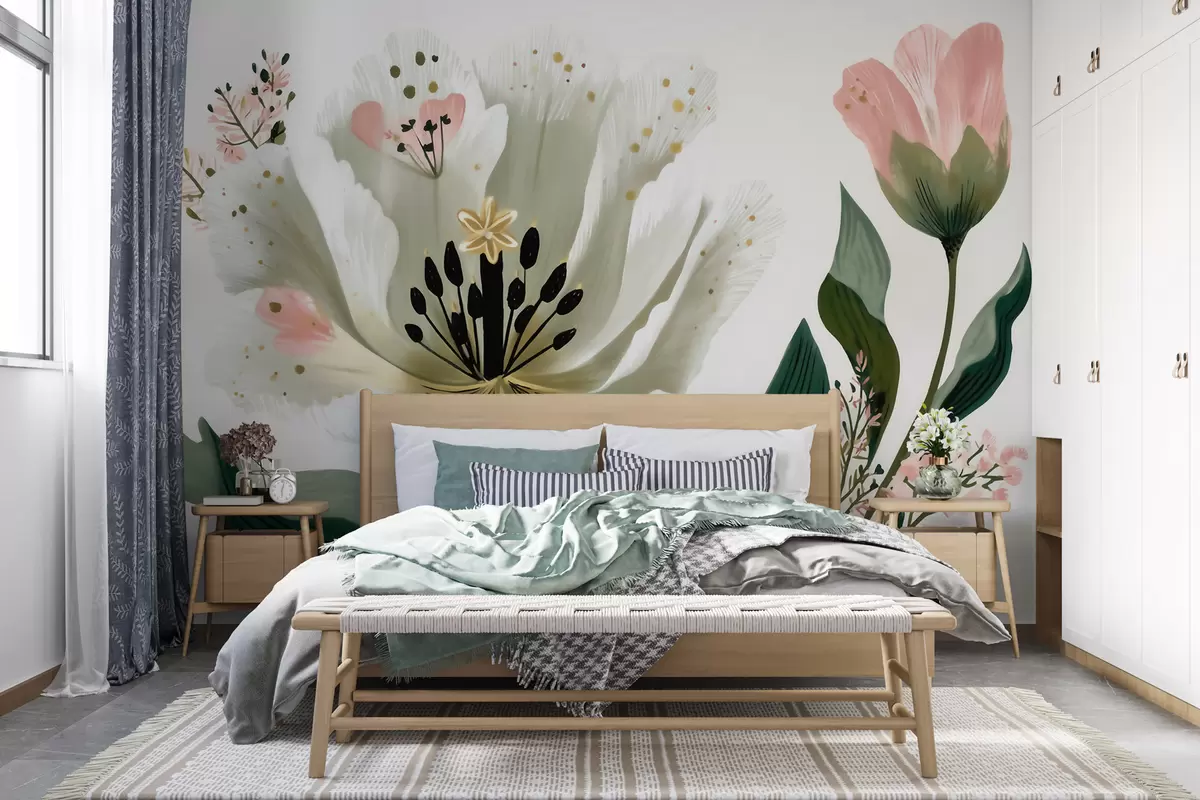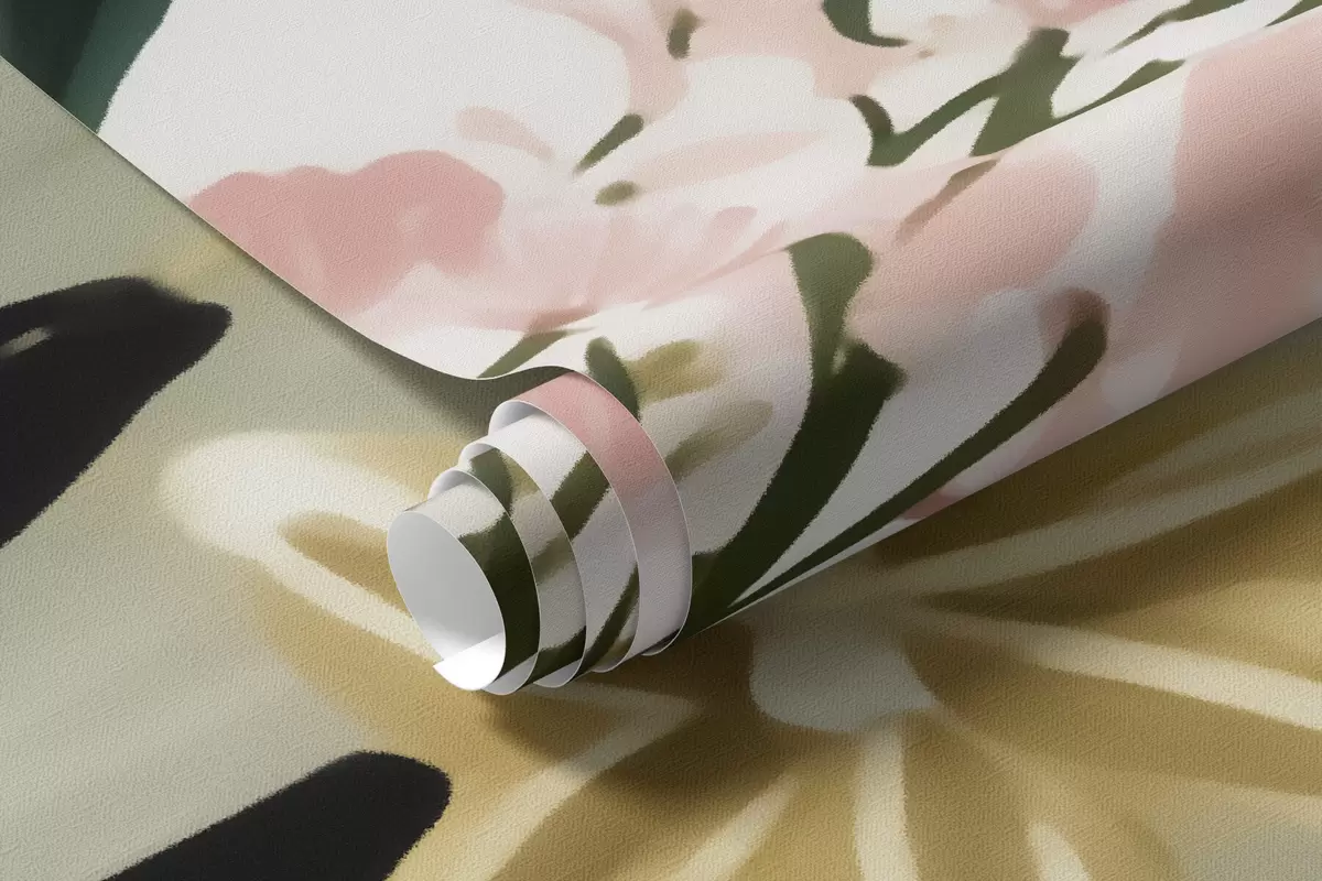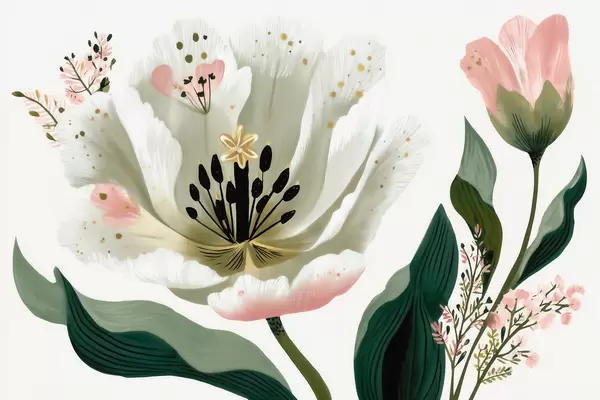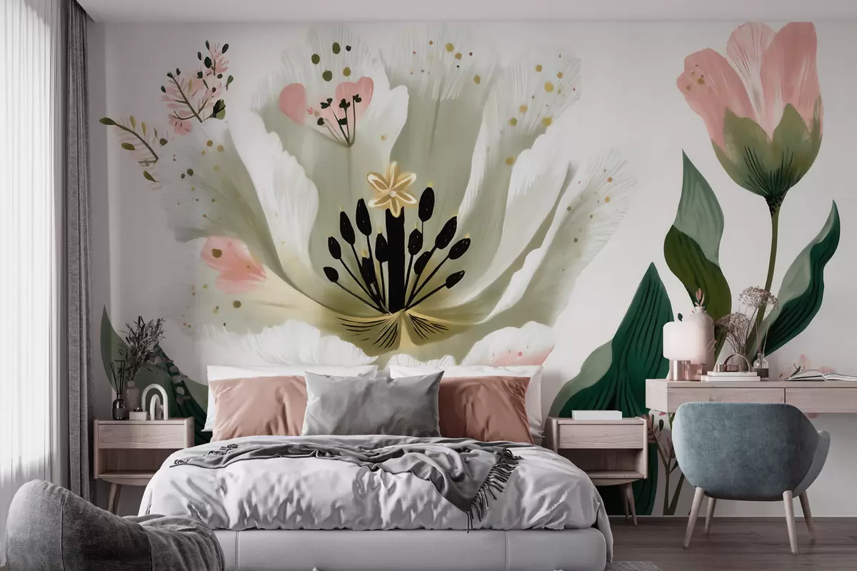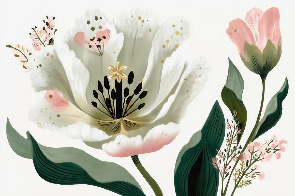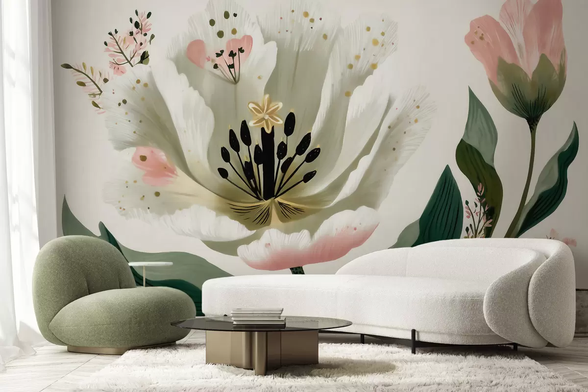 Τοιχογραφίες Ένα λουλούδι με πράσινα φύλλα και απαλές ροζ πινελιές σε στυλ ακουαρέλας Nr. w09836